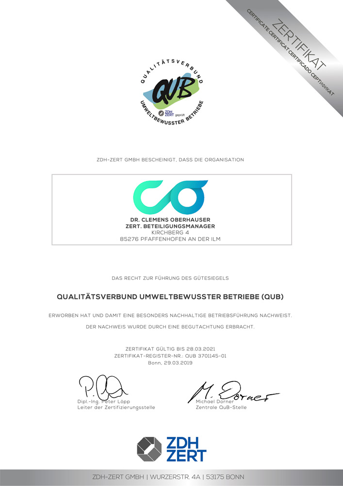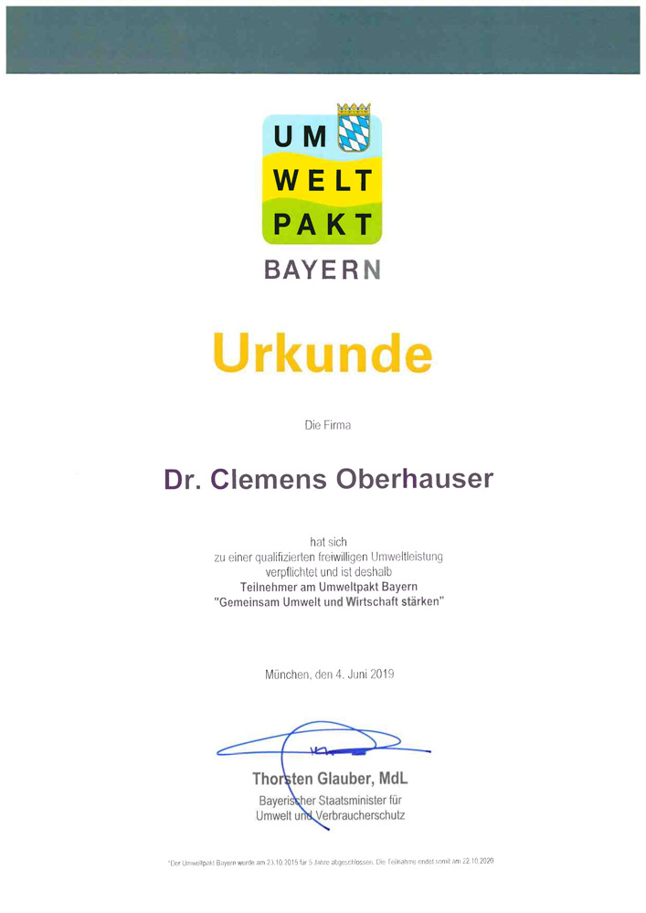 Mit der Teilnahme am Qualitätsverbund umweltbewusster Betriebe (QuB) trägt Dr. Clemens Oberhauser zum Umweltpakt Bayern bei und ist bis 22. Oktober 2020 Mitglied.